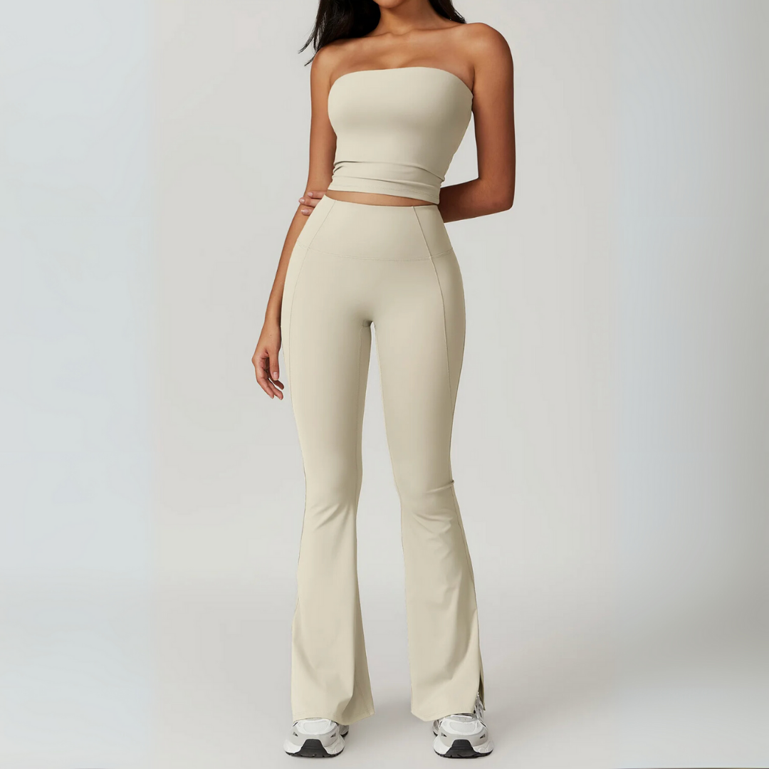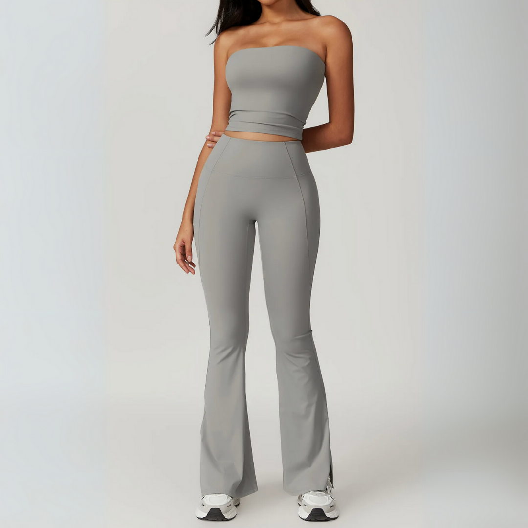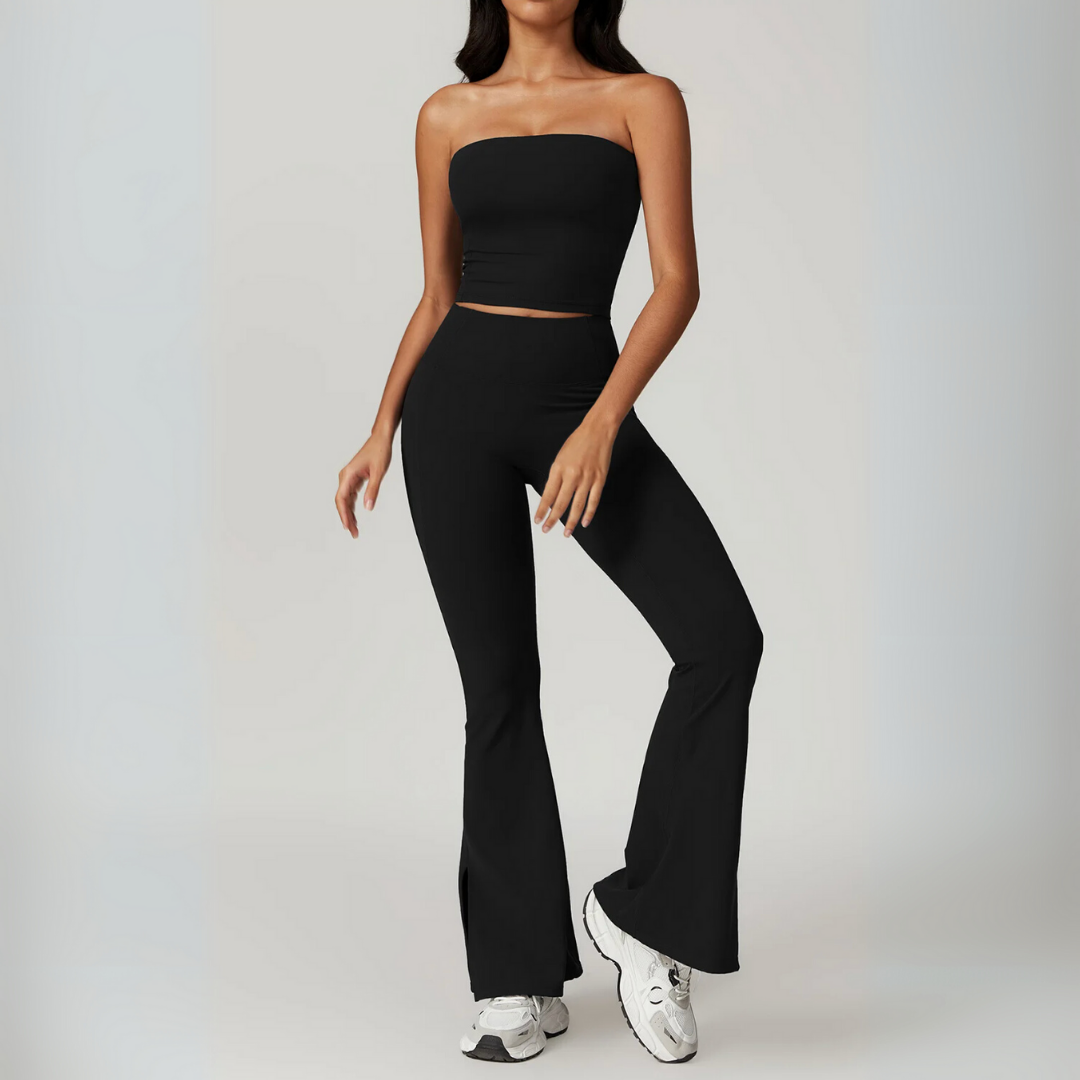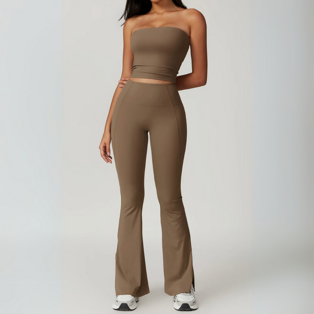 The Galicia Set brings minimalism and movement together in one sleek silhouette. Featuring a cropped bandeau-style top with built-in support and flared seamless leggings that contour and lift — this set is made to flow through every flex, walk, or lounge day with ease.