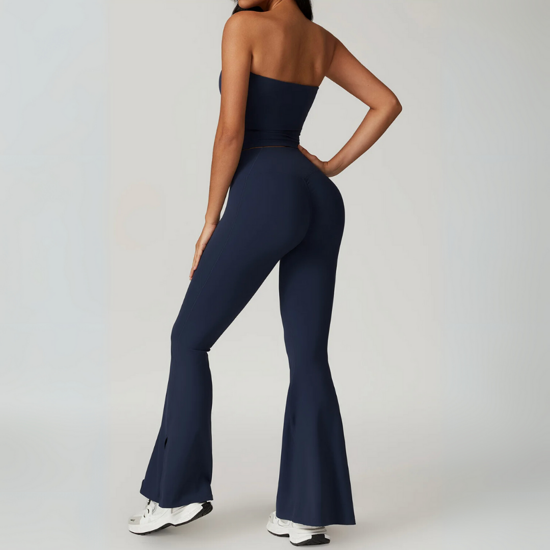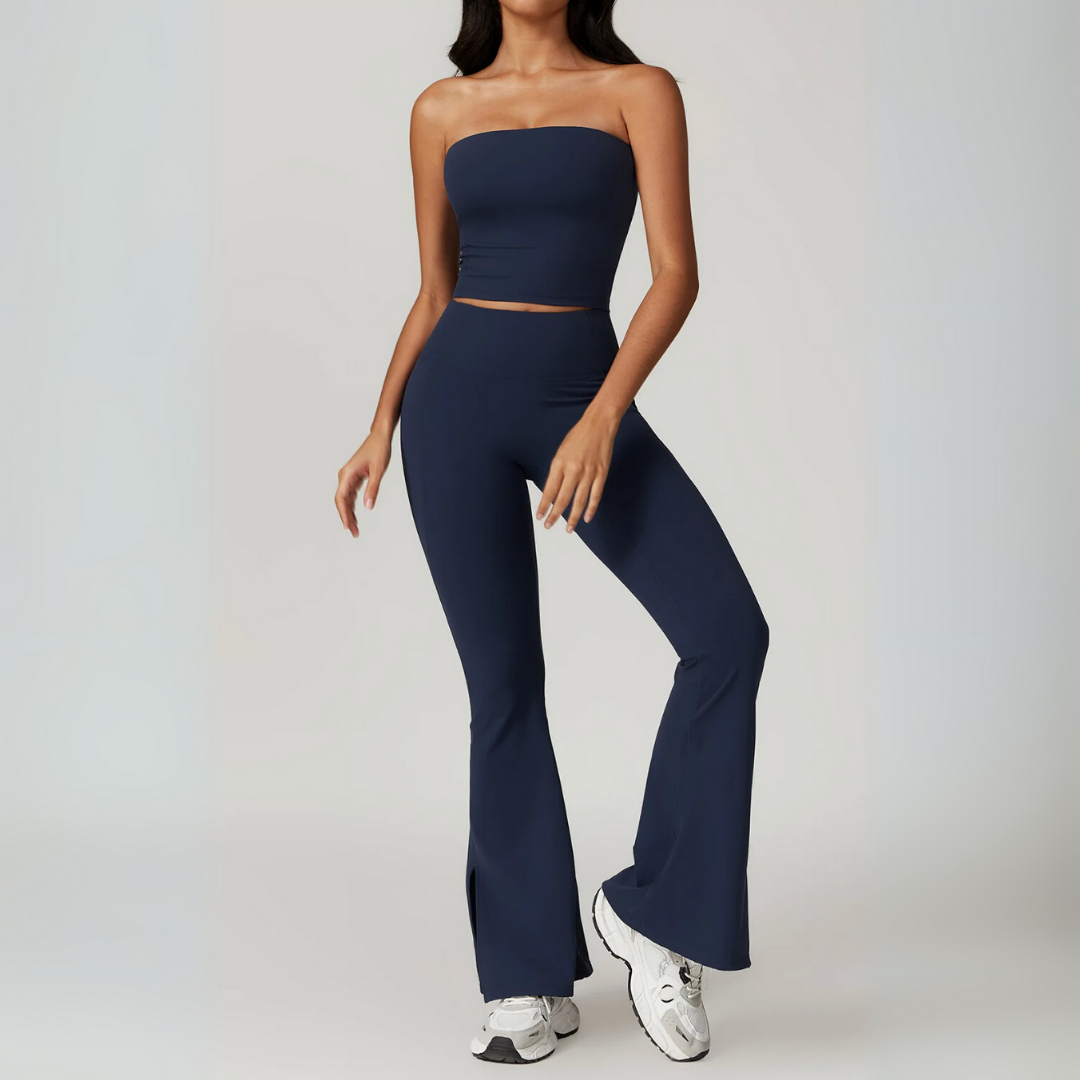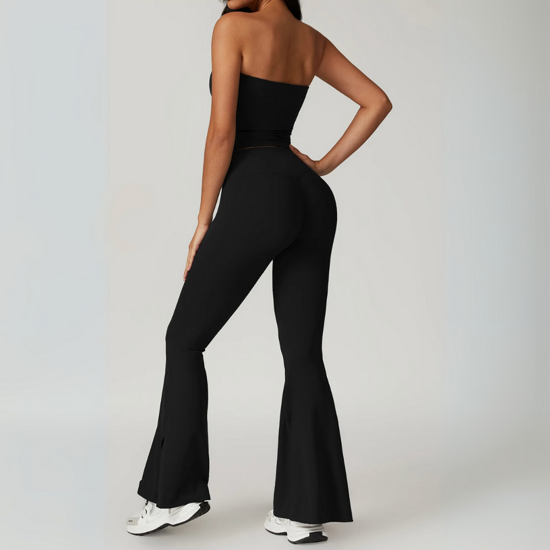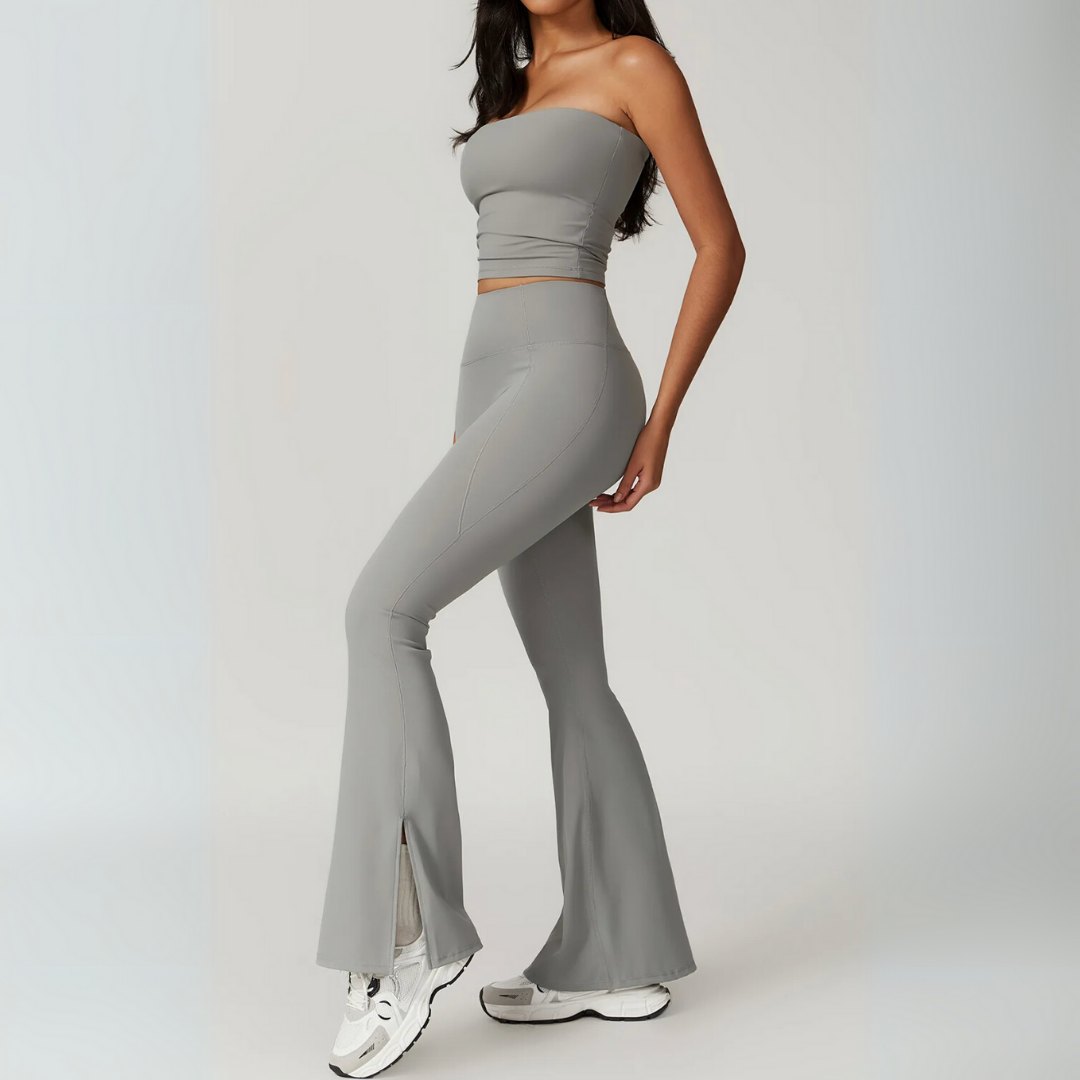 The Galicia Set brings minimalism and movement together in one sleek silhouette. Featuring a cropped bandeau-style top with built-in support and flared seamless leggings that contour and lift — this set is made to flow through every flex, walk, or lounge day with ease.