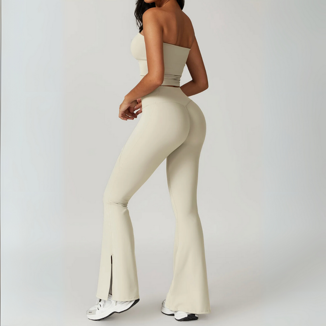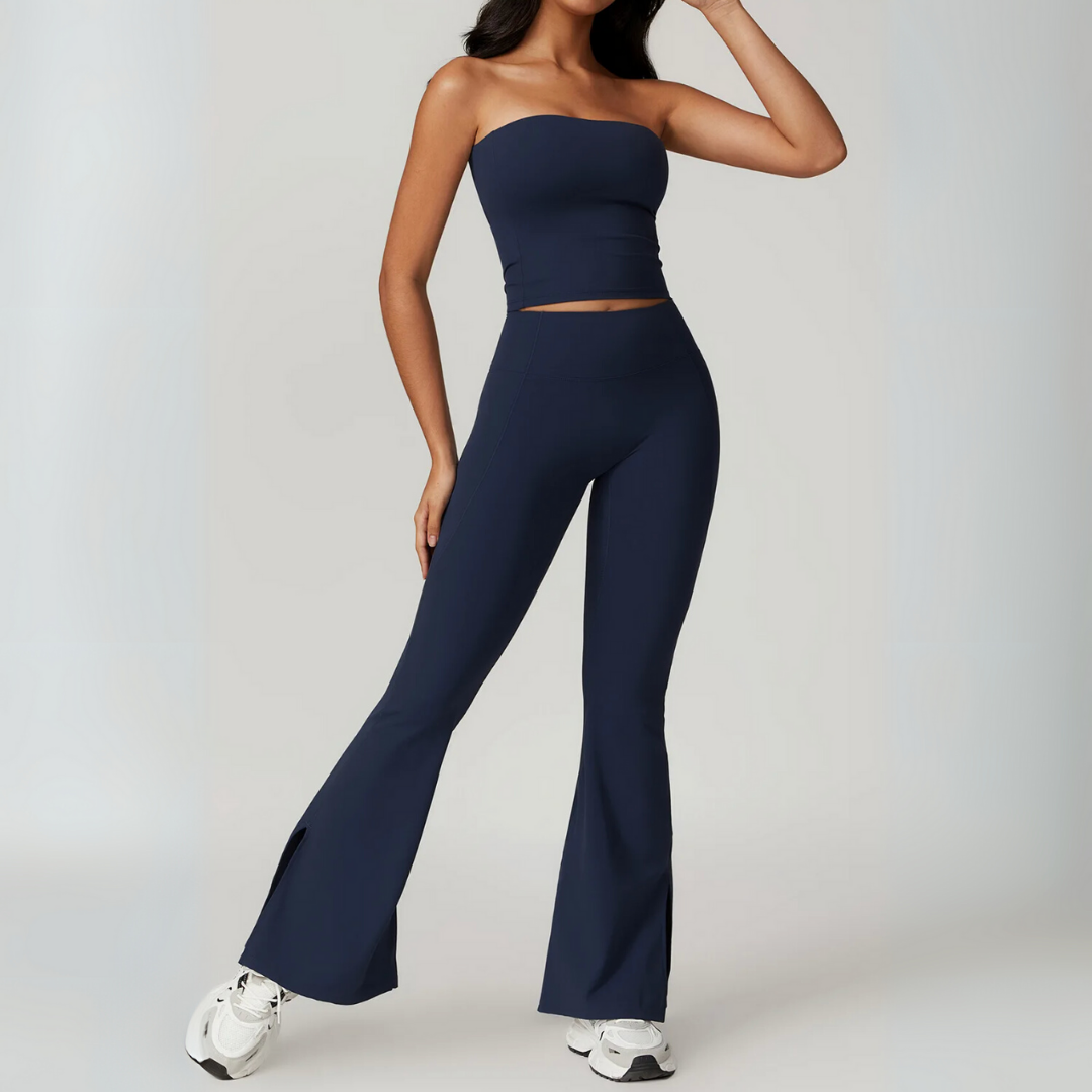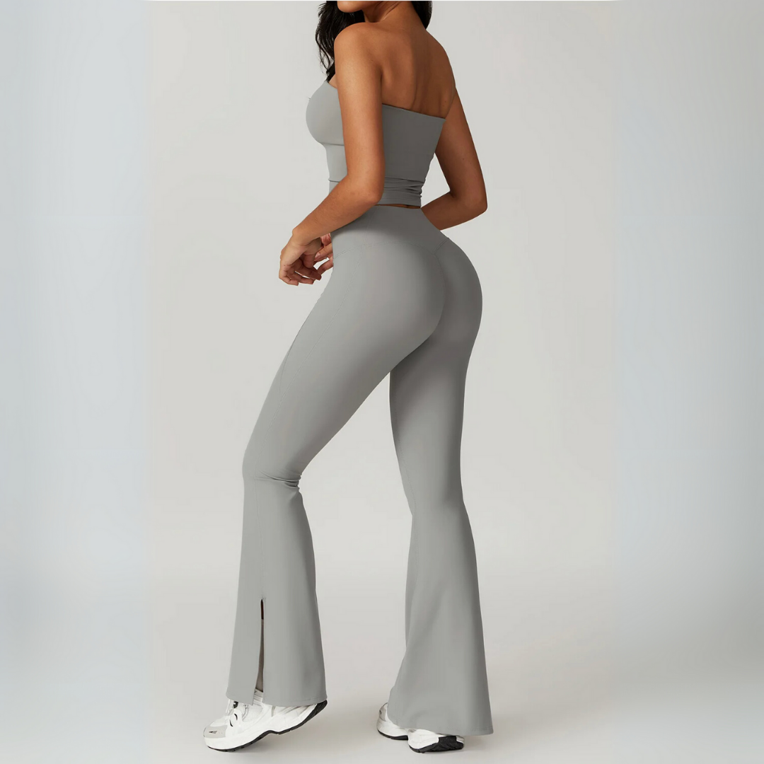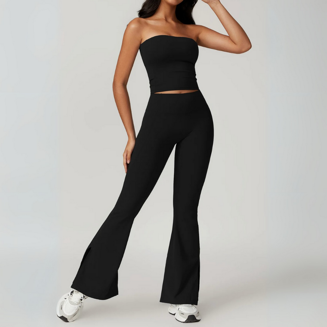 The Galicia Set brings minimalism and movement together in one sleek silhouette. Featuring a cropped bandeau-style top with built-in support and flared seamless leggings that contour and lift — this set is made to flow through every flex, walk, or lounge day with ease.